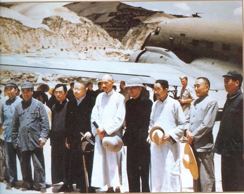 1945年7月,毛泽东(右一)和周恩(左一)来等欢迎飞抵延安的国民参政会参政员黄炎培(右二)等六人