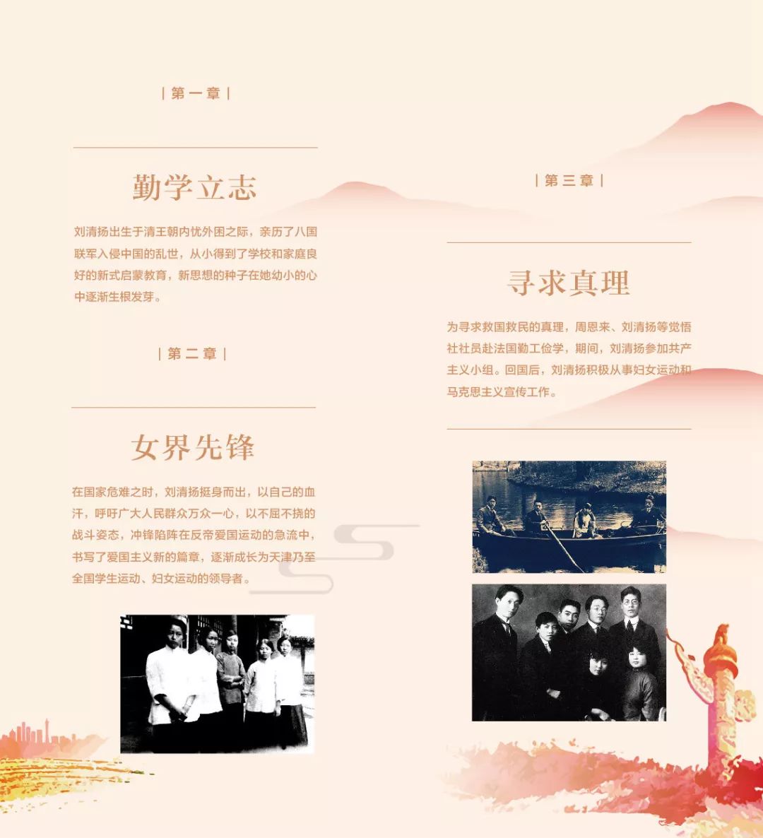 刘清扬在觉悟社时期曾经使用化名“念吾”,这也是此次展览名称的由来。“念初心 吾追寻——刘清扬生平事迹展”将从“勤学立志”“女界先锋”“寻求真理”“抗日救亡”“丹心报国”五个章节来回顾她的一生,追忆她坚持革命奋斗,走过荆棘坎坷,始终追寻的初心。